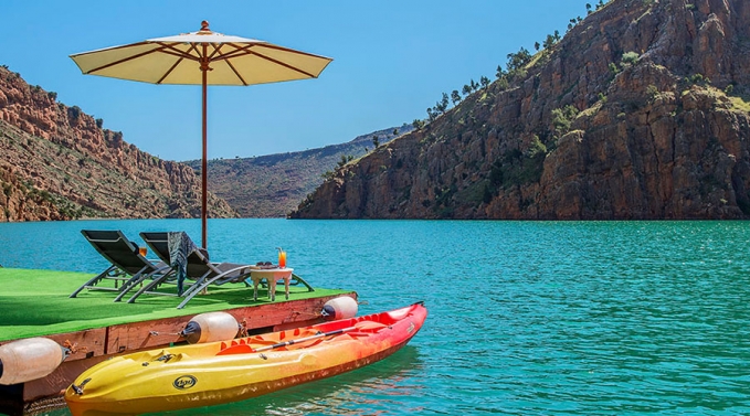 Le lac Bin El Ouidane se trouve à environ une heure de route des chutes d’Ouzoud à Azilal. Le barrage de Bin El Ouidane, construit au milieu du XXe siècle, culmine à 1 330 mètres d’altitude et s’étend sur 85 mètres de long. Ses vues à couper le souffle invitent à la location d’un bateau pour une promenade paisible et un bain de soleil. Nous vous recommandons l’hôtel Ouidane, l’un des rares établissements situés directement sur les rives du lac. Profitez du calme et de la détente. Les jeunes mariés garderont un souvenir impérissable de ce lieu enchanteur.