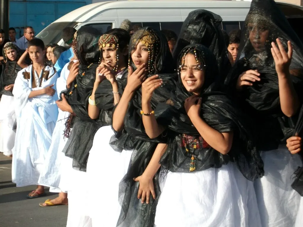 Voici la tenue traditionnelle des régions méridionales du Maroc. Vêtement issu de la culture touarègue, il est appelé « couverture du désert » en raison de sa présence fréquente dans le désert marocain. Rien n’est mieux adapté au climat désertique que cette couverture douce et légère. Les femmes du sud du Maroc portent également une jupe à volants, dont les découpes en dégradé rehaussent la beauté du costume traditionnel de cette région. Ces jupes sont généralement blanches, mais on en trouve aussi des bleues. Elles se portent avec une longue robe légère qui se drape sur la tête et s’enroule lâchement autour de la poitrine. Lors d’occasions spéciales, ce voile est orné de ceintures de coquillages ivoire et de fils de soie noire, apportant une touche touarègue raffinée à la tenue traditionnelle des femmes du Sahara marocain.