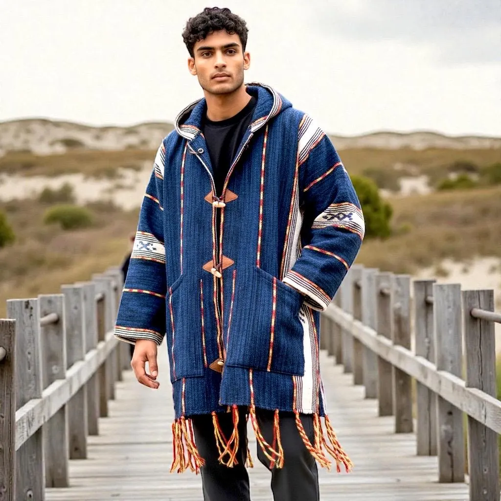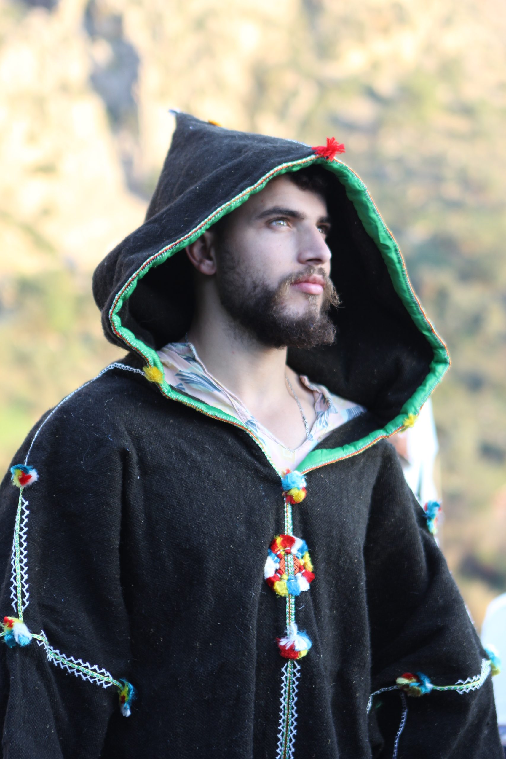 Il existe différents types de djellabas pour hommes, chacun arborant un motif reflétant sa région d’origine. La djellaba est un vêtement long à capuche, et les modèles les plus célèbres sont confectionnés dans la région de Bzou, dans le Moyen Atlas. Elle se porte avec le selham, un manteau drapé par-dessus la djellaba, souvent muni d’une capuche. Traditionnellement brodé, le selham est aujourd’hui privilégié par les Marocains dans une couleur unie. Dans les montagnes du Rif, les femmes portent un épais manteau de coton à rayures droites pour se protéger du froid. Dans l’Atlas, elles portent l’ahandra (une sorte de châle).
